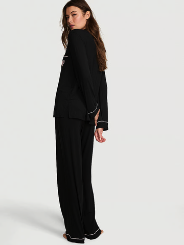 Этот удобный комплект состоит из верха на пуговицах спереди и брюк с легкими завязками из нашего фирменного, любимого клиентами модала, с маслянистым ощущением и идеальным количеством эластичности.