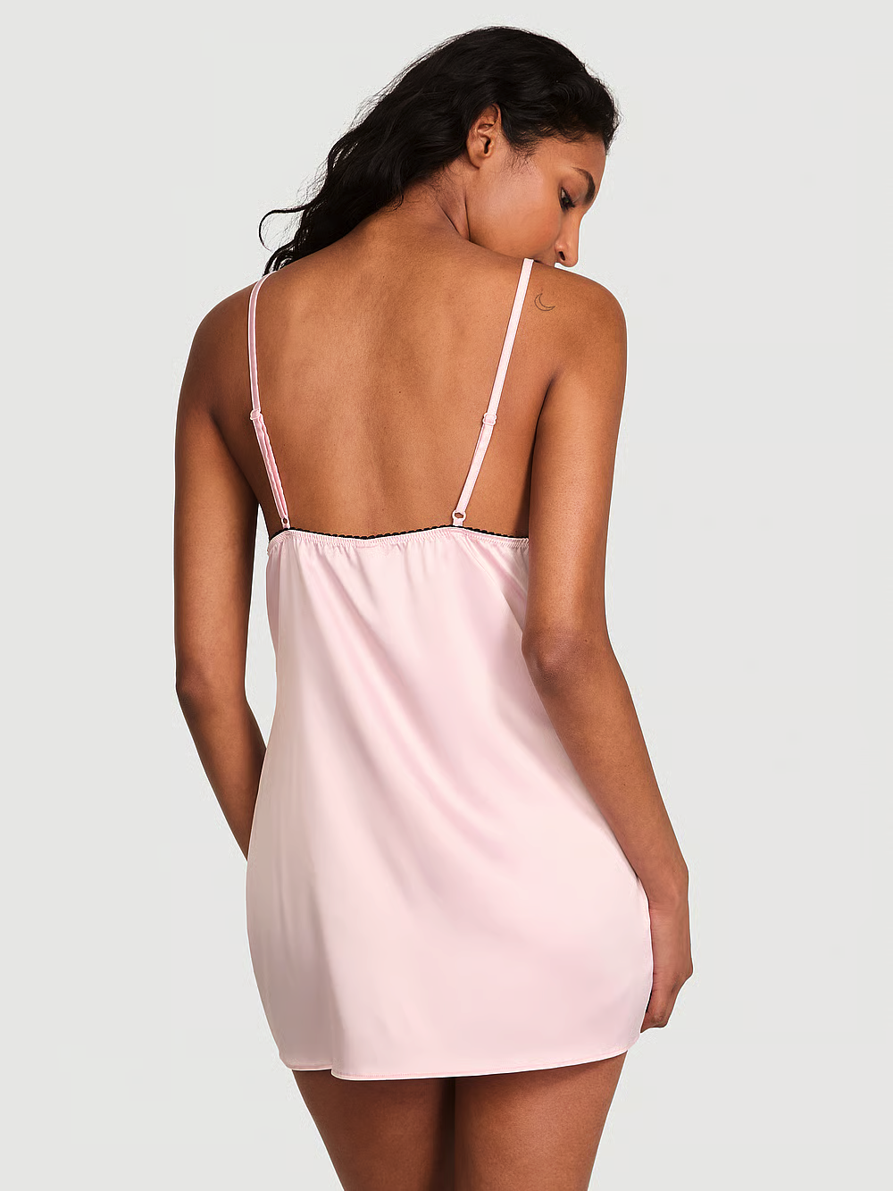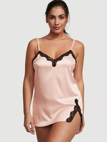 A slinky little dress combining sheer lace on top with a lustrous satin skirt that skims over curves.