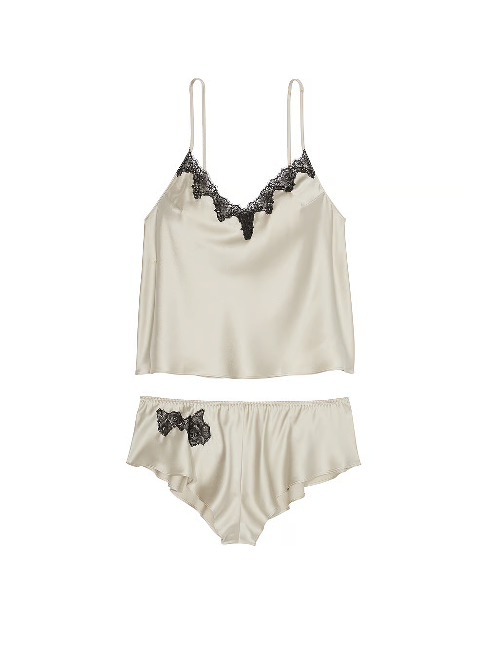 Этот глянцевый комплект, ставший классикой, отделан нашим культовым розовым кружевом для создания женственного образа. Сочетайте майку с любимыми джинсами и блейзером, чтобы создать ещё больше стильных образов.